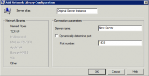 For the new alias, ensure you enter the source server instance name as the Alias Name, select TCP/IP and enter the new server name as the Server.