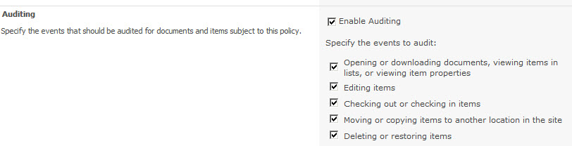 I decided to completely remove my solution and re-created the site collection with a blank team site. From here, I enabled the SharePoint Server Standard Site Collection features site collection feature, which is required to enable the information management policy setting in the site. Once enabled, I edited the Item content type and enabled auditing.